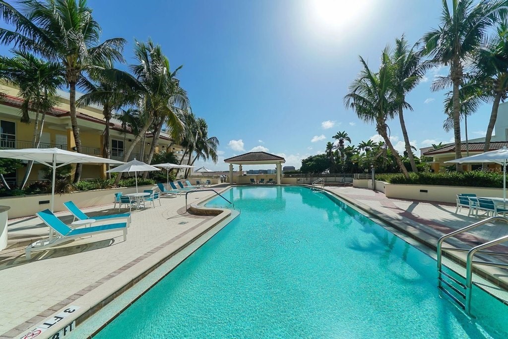 REFINED DOWNTOWN LIVING: A FURNISHED TURNKEY RETREAT AT ONE HUNDRED CENTRAL. Experience an elavated urban sanctuary in this chic, fully furnished residence at One Hundred Central. Unit C521 offers a unique villa-style experience on the coveted 5th-floor amenity level, where your front door opens directly onto a lush, tropical resort-style pool deck. Enjoy immediate, convenient access to the heated pool and spa-creating a backyard feel in the heart of the city. This bright and airy 2-bedroom, 2-bath retreat is designed for effortless living and entertaining with 1,114 sq. ft. The open-concept interior impresses with 9'4" ceilings, crown molding, maple cabinetry, and granite countertops. Newer appliances provide peace of mind, including a new Carrier A/C (2023) and a Rheem hot water heater. Impact-resistant sliders lead to a private balcony and additional climate-controlled storage. Plus two side-by-side parking spaces on the fourth-floor garage level adds rare value to this downtown gem. One Hundred Central is a premier, pet-friendly building (2 pets, any size!) featuring elite services, including a 24-hour concierge, fitness center, movie theater, art studio, and a private guest suite for your visitors. The location is truly second to none. You are literally steps from Whole Foods, Starbucks, and Main Street's world-class dining and arts scene. When the coast calls, you are just minutes from the Bayfront, the designer boutiques of St. Armands Circle, and the powdery white sands of Lido and Siesta Key. Whether you are seeking a seasonal escape or a sophisticated full-time residence, this turnkey sanctuary is ready for you to move in and start enjoying the Sarasota lifestyle today!